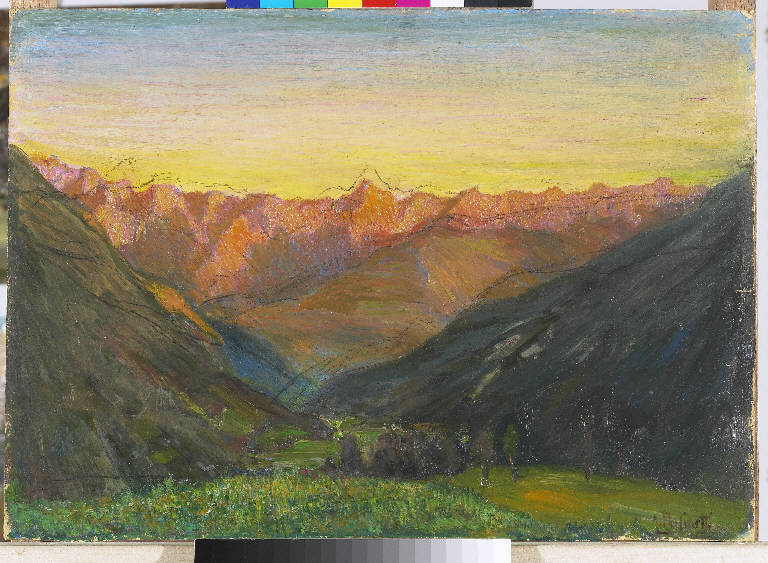 - NOTIZIE STORICO CRITICHE I ripensamenti e le correzioni dei profili montuosi denotano il lungo iter compositivo adottato dal pittore come metodo di lavoro. Il dipinto, inoltre, risulta essere la sequenza successiva a un bozzetto di minore formato (Pinacoteca Pasinetti, Montichiari, Brescia, Inv. PPMTA00286).