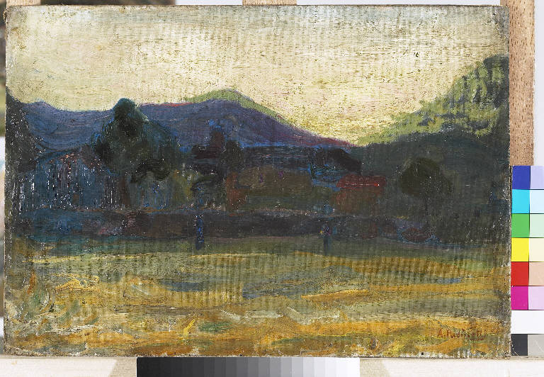 - NOTIZIE STORICO CRITICHE Durante tutta la sua carriera artistica Antonio Pasinetti rivolge grande interesse alla rappresentazione di particolari situazioni luministiche come in questa tela in cui l'attenzione è rivolta al contrasto cromatico tra i toni tenui del cielo e i colori violacei della montagna.