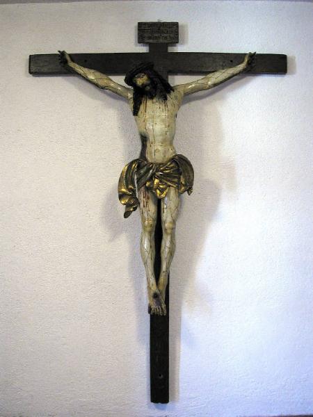 - NOTIZIE STORICO CRITICHE Il grande crocifisso, scolpito in un unico tronco di legno di cirmolo a cui sono state aggiunte le braccia in massello, proviene dall'antica chiesa parrocchiale di Gandino costruita nel XV secolo e fa parte attualmente della collezione permanente del Museo, benché, durante la quaresima, sia ancora utilizzato sopra l'altare maggiore della basilica. Il Cristo, grondante di sangue, è colto nel momento della morte e sul suo corpo sono presenti i segni delle atroci sofferenze, anche se le forme anatomiche conservano un'armonia di stampo classico. Le braccia sono snodabili e permettono di trasformare la statua in un Cristo morto, necessario nelle liturgie della settimana santa. Il realistico gonfiore in corrispondenza delle vene e delle piaghe è stato reso con l'applicazione di uno spago leggero sopra la preparazione e prima di ulteriori strati di gesso. Già riferito alla cerchia dell'intagliatore bavarese Michael Erhart entro un arco cronologico tra la fine del XV secolo e l'inizio del successivo (Savoldelli), il crocifisso è stato ricondotto recentemente da Andrea Franci al cosiddetto Maestro di Heiligenblut, attivo in Tirolo e Carinzia e così chiamato dal monastero di Heigenblut che si trova in Austria (Carinzia). Questo riferimento si basa sul confronto con i crocifissi nella chiesa parrocchiale in San Giorgio a Terenten e nella chiesa di sant'Andrea a Vals, che presentano lo stesso sanguinamento diffuso con il particolare dei rivoli di sangue che riappaiono da sotto il perizoma; vi si nota inoltre un analogo modo di panneggiare il perizoma svolazzante in modo simmetrico e anche di rendere i tratti del volto. La presenza di varie sculture e altri manufatti di area tedesca sud-orientale nel Museo di Gandino è da collegarsi all'intensa attività mercantile nel campo dei pannilana che dal XIV al XVIII secolo portò i più intraprendenti dei gandinesi a spingersi in tutta Europa ma in particolare alla fiera di Bolzano, in stretto contatto con il mondo austriaco.