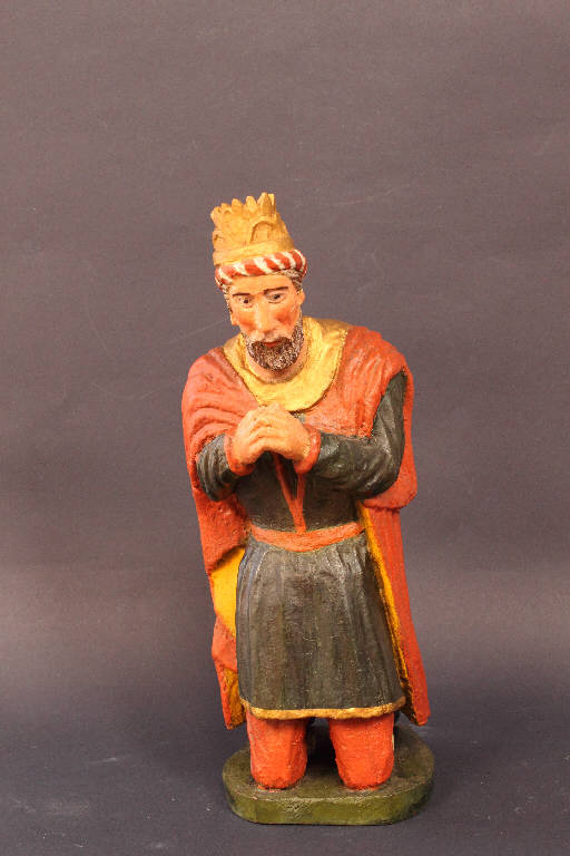 Scultura rappresentante un Re Magio inginocchiato e con le mani giunte.