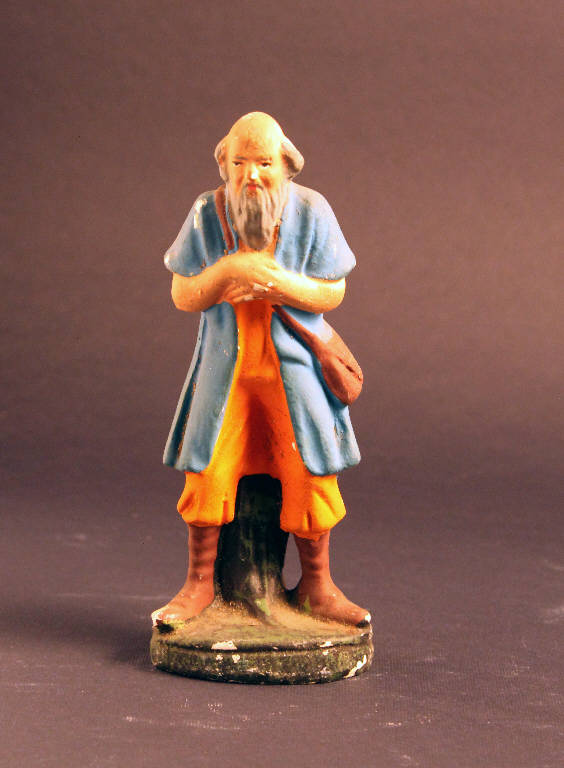 Statuetta rappresentante un pastore con pantaloni arancioni e camicia azzurra; recante una borsa a tracolla.