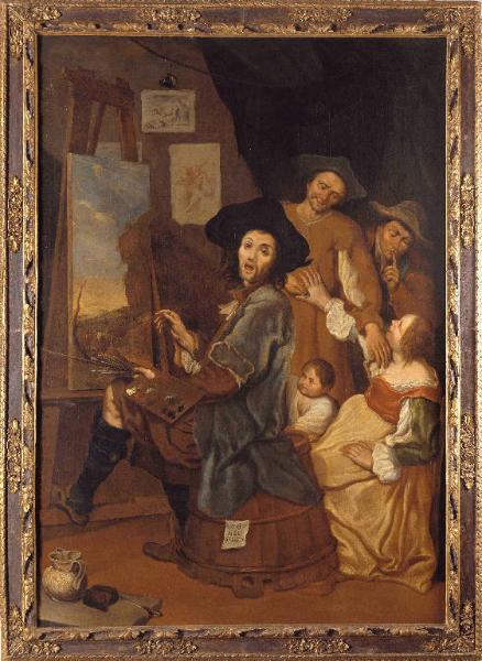 - NOTIZIE STORICO CRITICHE La tela costituisce il pendant del dipinto "La scuola di musica" (Inv. MLM63 ) custodito anch'esso presso il Museo Lechi di Montichiari (Bs). Le due opere sono ancora munite dell¿originale cornice e raffigurano due scene cosiddette "di genere" poiché legate alla realtà della vita quotidiana. Nel primo quadro un gruppo di mendicanti dediti alla musica armeggiano con alcuni strumenti popolari dell¿epoca, ormai desueti, come la "ciaramella" (nell¿angolo a sinistra) o la "ghironda" (in mano al bambino in primo piano). Più enigmatici invece i significati dell¿opera gemella, dove un pittore dall¿aria molto stupita è seduto a dipingere su un bigoncio e non si accorge (o finge di non accorgersi) del baratto che si svolge alle sue spalle tra una donna, si direbbe sua moglie, e due uomini. L¿iscrizione "vò nel segion", orienterebbe il senso della scena in direzione "comica", riconducendo all¿espressione dialettale lombarda "Dà on pè in la segia" (non avere più riguardi, mandare al diavolo ogni convenienza), il cui significato ben si adatterebbe a commentare la situazione. L¿identificazione dell¿autore dei due dipinti risulta complessa. L¿artista è vicino agli esempi di Todeschini, e ne condivide (nella Bottega del pittore) la vivacità mimica e la gestualità ammicante. Nella Lezione di musica la resa della scena è più sobria e lontana dal carattere comico, sembra dunque aprire la strada alla pittura di genere più meditata di Giacomo Ceruti il Pitocchetto. I due dipinti sono stati acquistati da Luigi Lechi nel 1969. (Notizie storico-critiche relative al progetto di aggiornamento di catalogazione del 2013-2014).