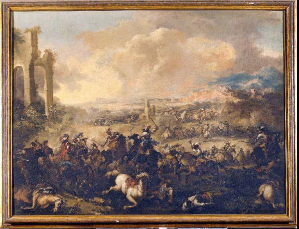 - NOTIZIE STORICO CRITICHE In seguito alla divisione della collezione Fenaroli Avogadro tra i fratelli Lechi, il dipinto fu assegnato all'attuale proprietario nel 1982. (Notizie storico-critiche relative al progetto di catalogazione del 2005).\n\nIl dipinto, assieme a un'altra tela (Inv. MLM82) custodita presso il Museo Lechi di Montichiari (Bs) faceva anticamente parte della collezione Fenaroli Avogadro conservata nella villa di Erbusco (Brescia). Successivamente le opere passarono per linea ereditaria alla famiglia Lechi. L¿alta qualità della stesura pittorica e la tonalità dei cieli, con le sfumature dei gialli che si fondono con i grigi, confermano l¿attribuzione al veneziano Antonio Maria Marini. Artista dalla pittura luminosa e serena capace qui di rimandare ai dipinti del classicismo seicentesco romano e bolognese. La presenza in collezioni bresciane di molte opere di Marini lascia ipotizzare un suo soggiorno tra il 1694 e il 1697 a Brescia, dove era notevole la diffusione di opere di pittori nordici nelle raccolte nobiliari. Un dettaglio che giustificherebbe, in quegli anni, la componente fiamminga dell¿artista, a cui fa riferimento, nel Traghetto, il particolare del personaggio col boccale di birra in mano. Nella Battaglia con rovine Marini segue invece gli esempi del napoletano Salvator Rosa (1615-1673) e fonde il genere della "battaglia" con quello della "rovina", entrambi assai apprezzati dai collezionisti del tempo. (Notizie storico-critiche relative al progetto di catalogazione del 2013-2014).