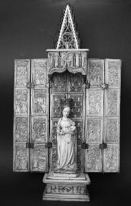 Tabernacolo a sportelli mobili composto da quattro ante, posizionate a coppie a lato del dossale fisso, snodate e legate a cerniera. Il dossale è coronato da un baldacchino pensile ad archi trilobati ribassati, decorato con bifore su fondo che finge una divisione in conci; al di sopra, cuspide decorata con rosetta centrale ed elementi gotici. Il fondo del dossale è suddiviso in otto riquadri rettangolari e decorato con gigli in rilievo su trama lineare ad incrocio. La struttura poggia su uno zoccolo rettangolare, che sostiene anche una statuetta di Madonna con Bambino.\nLa Madonna è raffigurata con una corona gigliata, indossa una lunga veste, insieme ad un lungo manto poggiato sulle spalle. Tra le braccia regge il Bambino, avvolto in un panno, che tiene in bocca un dito della mano destra mentre nella sinistra tiene un pomo.