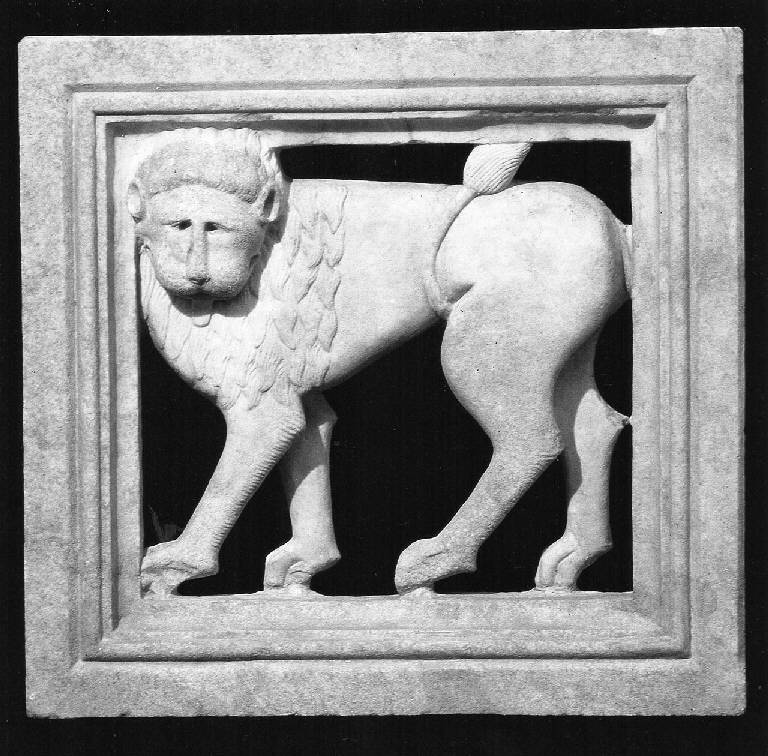 Lastra quadrangolare lavorata a traforo, con figura di leone che la occupa quasi per intero, rappresentato con corpo di profilo e muso frontale.