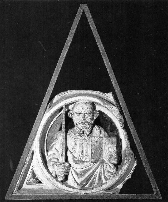 Frammento di lastra triangolare (mancano l'angolo superiore e laterale destro) con figura di San Paolo che regge la spada (mano sinistra) e un libro aperto (mano destra), racchiusa in un cerchio. Capelli e barba del santo presentano una lavorazione a tratti paralleli; la parte alta della veste presenta una fascia decorata. Nell'angolo sinistro, decorazione a trifoglio.