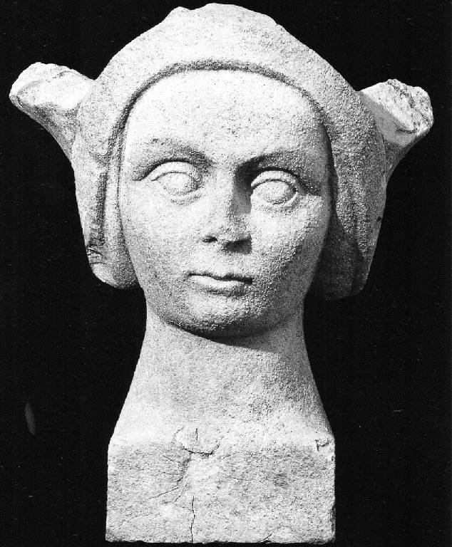 Testa bifronte frammentaria scolpita su base a parallelepipedo, da cui parte il collo abbastanza tozzo, con copricapo arcuato composto da una fascia stondata e coronata da decorazioni che sporgono lateralmente. La parte posteriore è priva dei lineamenti.
