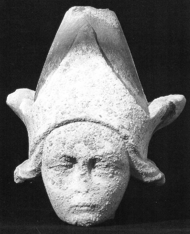 Testa a tutto tondo, bifronte, priva del volto nella parte posteriore, con copricapo a pigna privo di losanghe con punta stondata, elemento triangolare nella parte frontale, e protuberanze laterali, da cui fuoriescono due ciocche di capelli simmetriche.