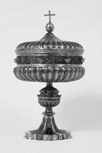Base con cornice mistilinea divisa in sei spicchi decorati con motivi floreali e tre scudi smaltati (Buon Pastore, ostensorio ambrosiano con colomba, insegna Malaspina). Nodo a superfici convesse e concave, sbalzate e cesellate, con piccole volute. Coppa con decorazione a baccellatura grande che ricopre la base del corpo e il coperchio, che termina con una croce appoggiata sopra un globo. La parte alta della coppa presenta una decorazione a fascia con testine alate di cherubini in rilievo.