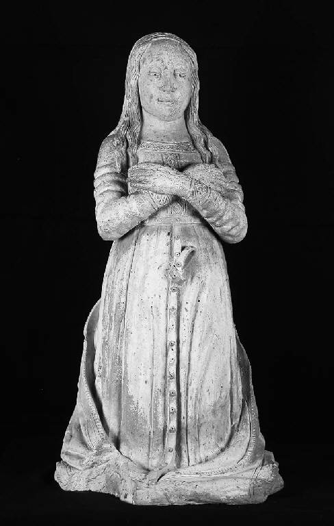Statua a tutto tondo raffigurante Maria Vergine inginocchiata, le braccia incrociate sul petto; è abbigliata con una veste a maniche lunghe, decorata lungo i polsi, lo scollo e la fascia centrale del corpetto; la parte inferiore dell'abito presenta una cintura che scende dalla vita fino a terra, a rilievo. Tutto attorno al corpo, nella parte bassa, è disposto un manto drappeggiato e lavorato lungo i bordi, che nella parte posteriore, e in parte anche nella zona anteriore, si presenta mutilo.