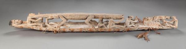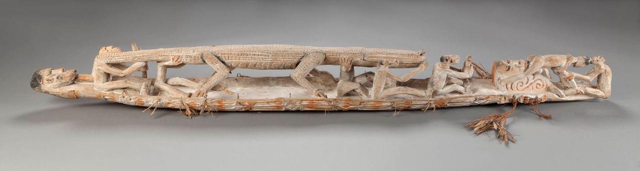 Canoa con varie figure scolpite: al centro un grosso coccodrillo affiancato da due figure umane sedute. Davanti e dietro ad esso vi sono altre due figure umane con remo. Le prue sono formate da sculture di testa umana. Sulla pruna anteriore sono scolpite due figure umane: una sdraiata e una seduta. Il corpo della canoa presenta decorazioni in rilievo bianche e rosse e ciuffi di foglie di sago lungo tutto il perimetro.
