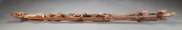 Canoa con scolpite figure di animali: una tartaruga e uccelli. I bordi della canoa sono intagliati e decorati con motivi geometrici a rilievo dipinti in colore rosso