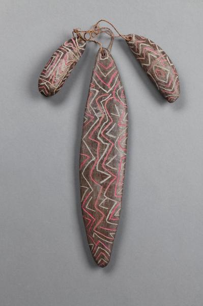 Tre pietre dalla forma ovale e allungata, legate insieme attraverso una corda sottile. La pietra centrale è più grande rispetto alle altre due. Tutte presentano incisioni in bianco e in rosso che formano motivi geometrici. Ogni pietra ha un vertice forato attraverso il quale passa la corda che le lega insieme.