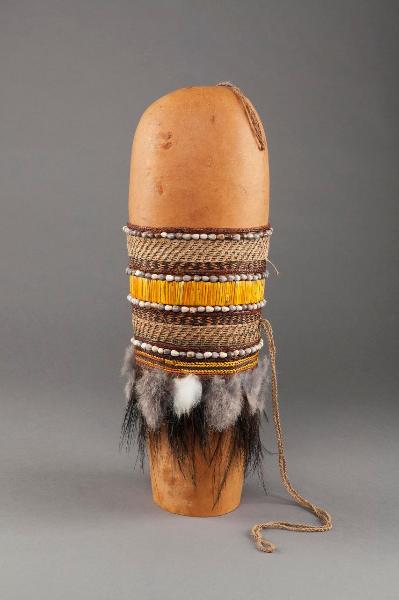 Astuccio penico ricavato da una zucca essiccata e svuotata. L'oggetto è avvolto orizzontalmente da una fascia in fibra vegetale decorata con una successione di fasce: quattro realizzate in conchiglie cauri e una in listelli di bambù. Sul bordo inferiore di tale decorazione sono applicate piume e ciuffi di pelo (forse di cuscus). Alla fascia è inoltre applicata uno spago per legare l'astuccio alla vita.