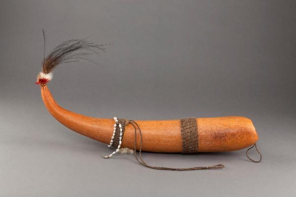 Astuccio penico ricavato da una zucca essiccata e svuotata. Dotato di due fasce orizzontali di fibre intrecciate. La fascia superiore è di dotata di una decorazione in cauri e di corda per legare l'ornamento alla vita. Sull'estremità superiore sono applicate piume e ciuffi di pelo.