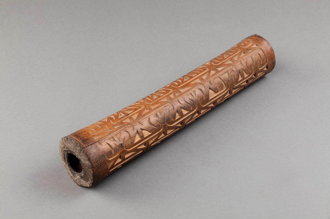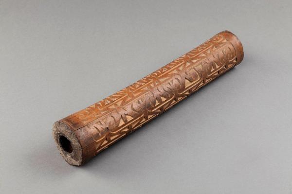 corno (strumento musicale) interamente decorato con incisioni tondeggianti in rilievo.