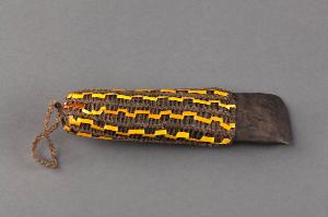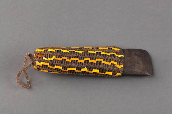 Pietra piatta levigata dalla forma allungata, inserita per tre quarti entro un astuccio realizzato con un intreccio di fibre vegetali. Tale astuccio presenta una decorazione a righe verticali intrecciate con fasce di rattan. Sull'estremità di tale astuccio è legato un corto manico in fibra vegetale.