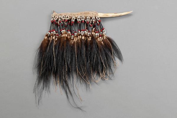 Pugnale rituale in osso appuntito, avvolto sulla parte superiore da una fascia in fibra vegetale intrecciata. A tale fascia sono applicati una serie di fili che formano una linea verticale. Ogni filo è decorato con vaghi costituiti da cauri e semi rossi. Ognuno termina con un ciuffo di piume scure di casuario.