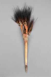 Pugnale rituale in osso di forma allungata e terminante con una punta triangolare. L'estremità superiore è avvolta da un cappuccio in fibra vegetale intrecciata, che presenta una fascia colorata in rosso sul bordo inferiore. Sulla sommità di tale cappuccio, anc'esso colorato in rosso, sono applicate alcune frange dello stesso materiale, rosse, ognuna terminante con un conchiglie cauri e un ciuffo di piume scure di casuario.