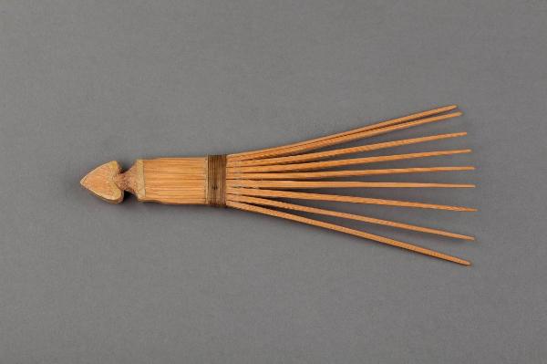Pettine in legno con lunghi denti intagliati da un unico pezzo di legno. Tra i denti e l'impugnatura è applicata una fascia in sottili fibre vegetali. L'impugnatura termina con un a fascia intagliata in rilievo decorata con incisioni a triangolo e l'estremità a forma di cuore.