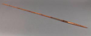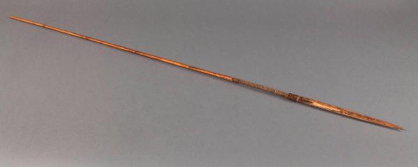 Freccia in bambù appuntito. Lungo l'asta è presente una fascia intagliata.