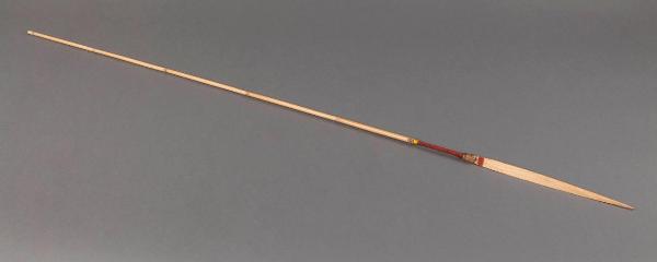 Freccia in bambù appuntito. Lungo l'asta, al termine della punta, è presente una fascia ricoperta in fibra vegetale rossa.