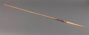 Freccia in bambù appuntito. Lungo l'asta, al termine della punta, è presente una fascia ricoperta in fibra vegetale rossa.