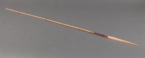 Freccia in bambù appuntito. Lungo l'asta, al termine della punta, è presente una fascia ricoperta in fibra vegetale rossa.