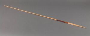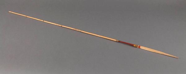 Freccia in bambù appuntito. Lungo l'asta, al termine della punta, è presente una fascia ricoperta in fibra vegetale rossa.