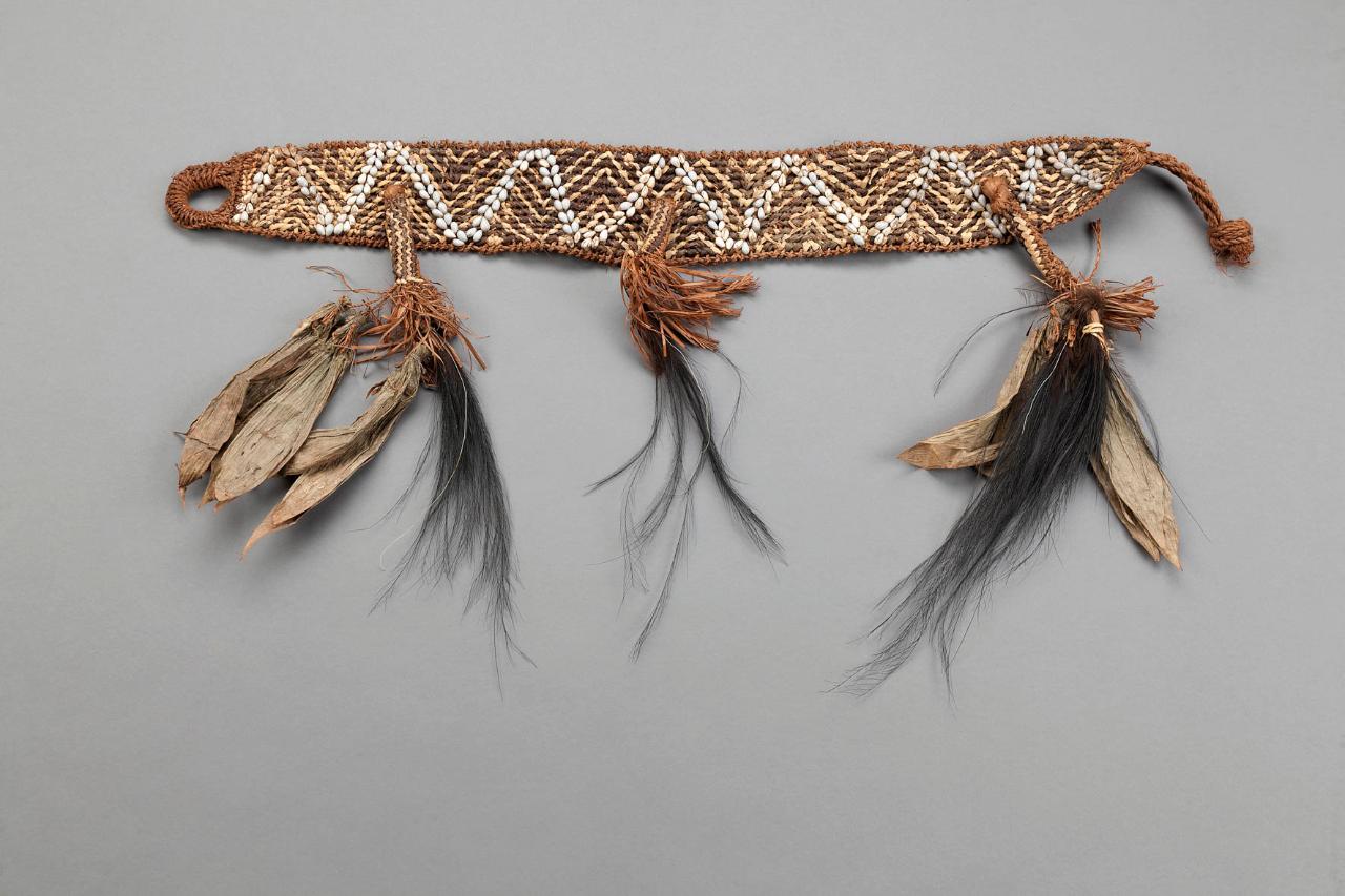 La cintura si compone di una fascia in fibra vegetale intrecciata. Su di essa è applicata una decorazione in semi bianchi che formano sette triangoli. Al centro della fascia e sui lati vi sono tre strisce in fibra vegetale a cui sono legati frammenti di foglie di sago e piume di casuario nere. Alle due estremità sono applicati un'asola e un laccio per chiudere la cintura.