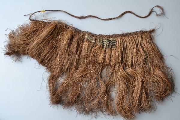Gonna in fibre vegetali legate su una fascia in fibre intrecciate. Una parte della gonna presenta una lunghezza ridotta rispetto al resto della parte coprente. La gonna si chiude grazie ad un'asola e a un laccio applicati sulle estremità superiore della fascia. Nella parte centrale superiore è presente una decorazione in fibra vegetale colorata con righe orizzontali nere.