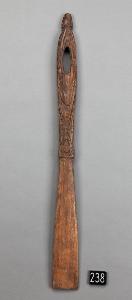 L'oggetto, dalla forma di spatola, presenta un'impugnatura in legno intagliato con motivi geometrici in rilievo. Sul vertice è presente un foro. La parte inferiore dello strumento è in legno levigato ma non lavorato.