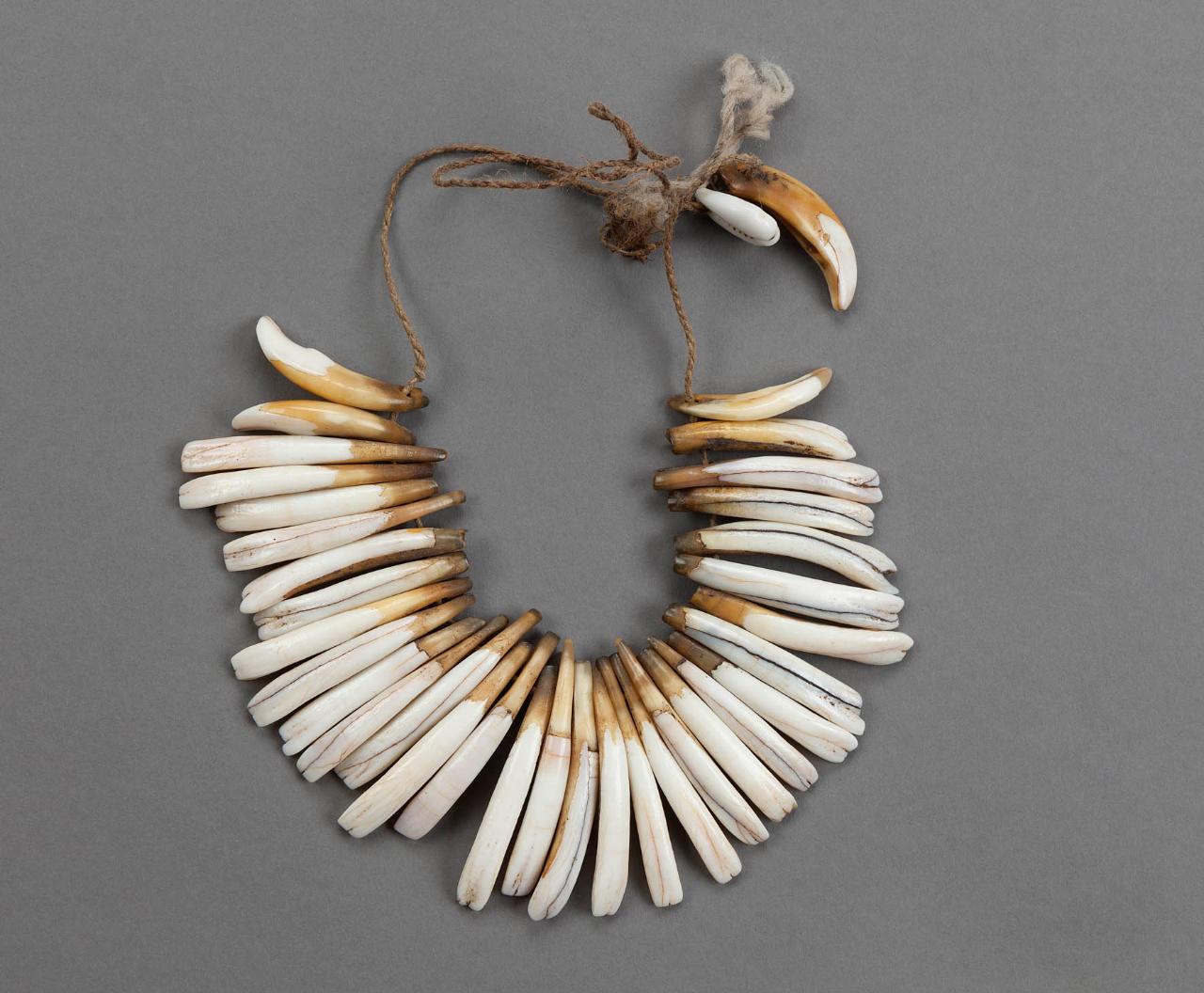 Collana con denti di cane infilati lunghi denti infilati entro una corda. L'ultimo vago è costituito da una conchiglia cauri.