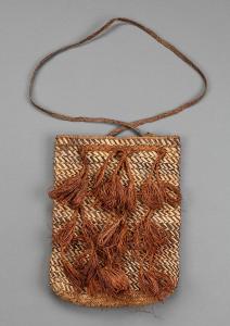 Borsa realizzata attraverso un intreccio di fibre vegetali. Presenti due manici sul bordo superiore. La sacca della borsa è decorata con frange intrecciate di fibre vegetali scure.