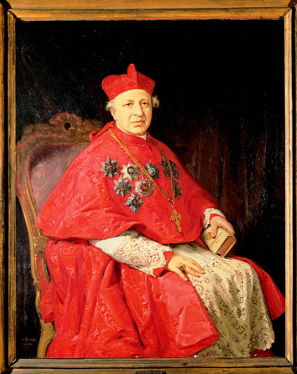 - NOTIZIE STORICO CRITICHE Il ritratto in esame fa parte di un gruppo di dipinti raffiguranti cardinali esposti nella Galleria detta dei Cardinali in Palazzo Frizzoni. Una delibera del Consiglio Comunale del 5 ottobre del 1896 approvò la commissione del dipinto al bergamasco Giuseppe Riva e il suo trasferimento in una sala del Municipio di Bergamo. Nel 1898 il ritratto fu esposto nello studio del pittore e solo nell'anno successivo venne collocato nell'antisala consigliare del Municipio di Bergamo. Raffigura Antonio Agliardi, nominato cardinale da papa Leone XIII nel concistoro del 22 giugno 1896. L'opera si caratterizza per una pomposità forse eccessiva, sottolineata dal porpora acceso dell'abito e soprattutto dal riflesso metallico delle nove medaglie insieme ad una croce d'oro appesa ad una pesante catena. Il cardinale Agliardi presenta caratteri ben diversi dall'altro cardinale ritratto dal Riva nel 1901, Mons. Felice Cavagnis, anch'esso conservato presso la Galleria detta dei Cardinali a Palazzo Frizzoni (Abbattista Finocchiaro A., 1993).