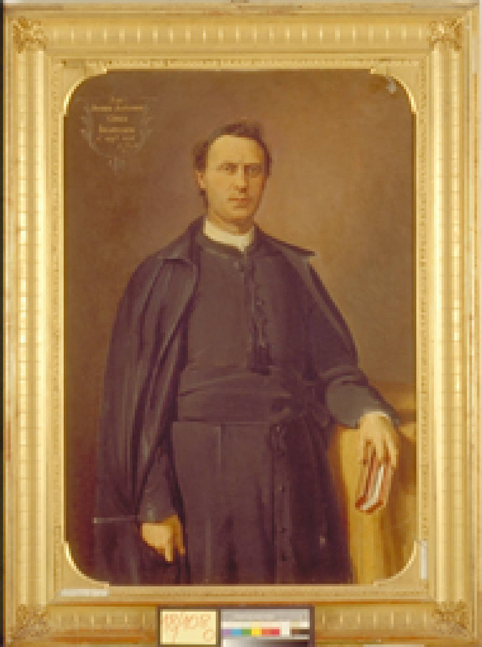 - NOTIZIE STORICO CRITICHE Il dipinto è inserito in una cornice di legno dorato. Raffigura Antonio Alessandri (Bergamo, 1839 - 1876), sacerdote, civico bibliotecario dal 1871 al 1876 e iniziatore della raccolta musicale. Professore di storia naturale e di fisica, compì studi sull'età geologica di Bergamo Alta che pubblicò nel 1875.