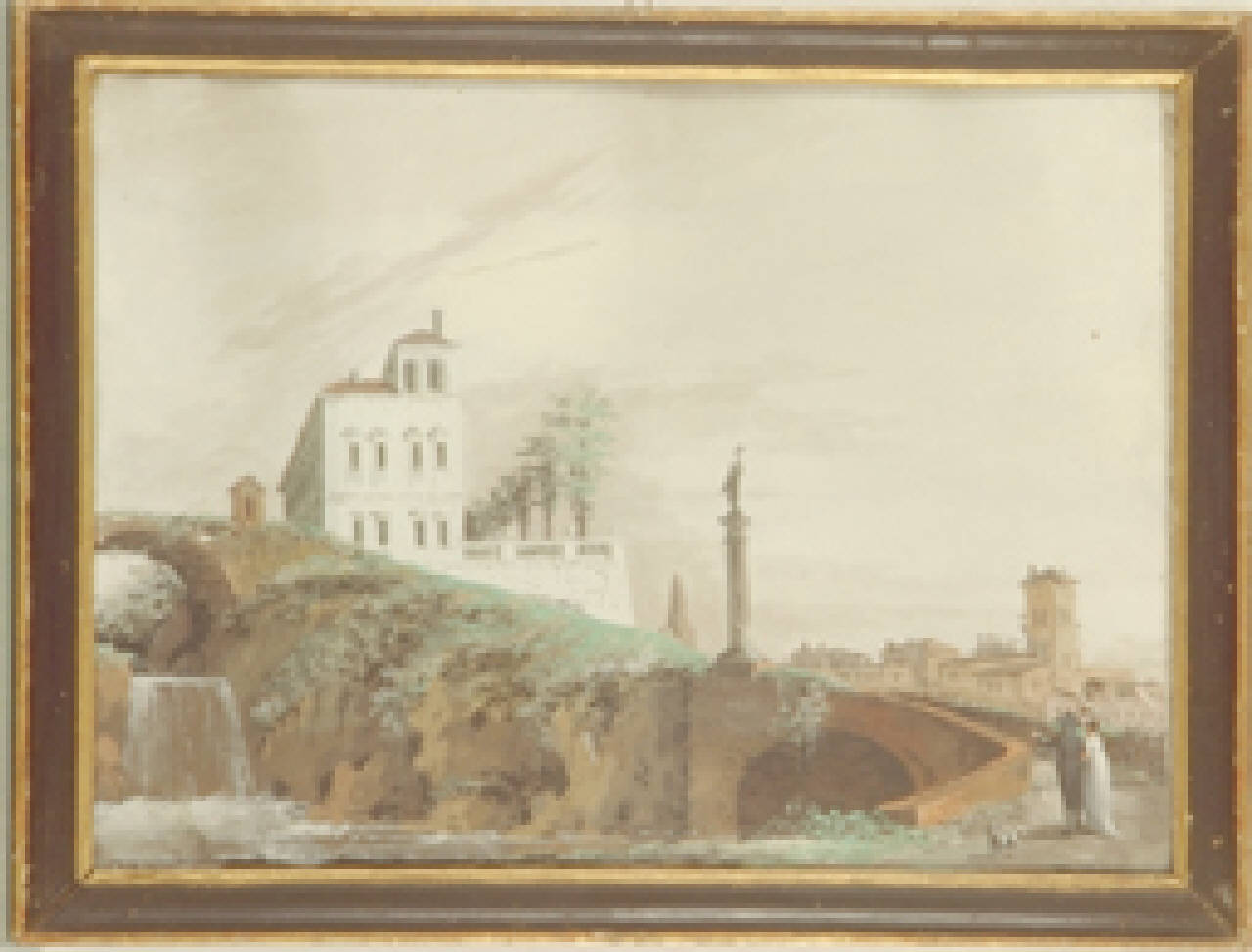 - NOTIZIE STORICO CRITICHE Insieme alle opere raffiguranti "Interno di locanda" e "Paesaggio con castello in riva al mare visto da una grotta", è una delle tre illustrazioni a tempera su carta del trevigliese Gaspare Galliari, discendente dalla nota famiglia di quadraturisti e scenografi, esposte nell'Ufficio Periodici. Originariamente la serie del Galliari era composta da cinque vedute, due delle quali sono in deposito nella sede dell'Ateneo di Scienze, Lettere e Arti di Bergamo. La serie proviene dall'ex Museo Camozzi-Vertova di Dalmine che conservava dipinti, busti, mobili, importanti cimeli e documenti del Risorgimento (successivamente suddivisi tra Biblioteca e Museo Storico).\nCatalogo Rossi: 420/B70.