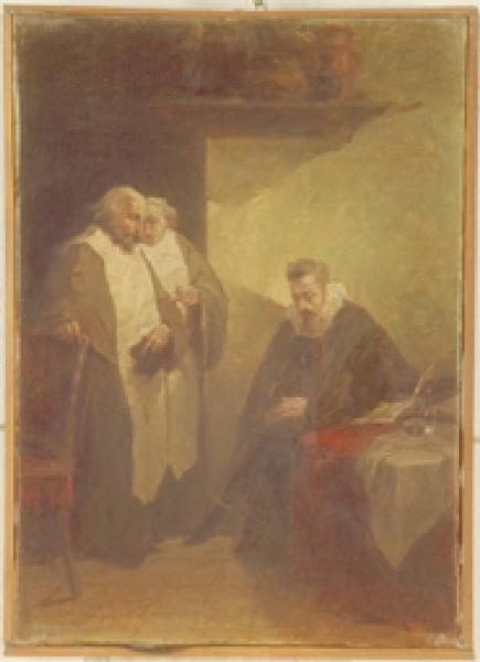 - NOTIZIE STORICO CRITICHE Donato dal professor Francesco Quarenghi nel 1936, il dipinto raffigura Torquato Tasso in una cella del convento dei Girolamiti di Sant¿Onofrio sul Gianicolo a Roma, dove il celebre poeta si ritirò nell¿aprile del 1595. E' una copia della pittrice Fulvia Bisi, tratta dall'incisione a bulino dal titolo "Gli ultimi momenti di Torquato Tasso", eseguita da G. Barni su invenzione di Giuseppe Bertini e pubblicata su "Gemme d'arti italiane" nel 1847 (anno III, p. 33).\nCatalogo Rossi: 404/B72.