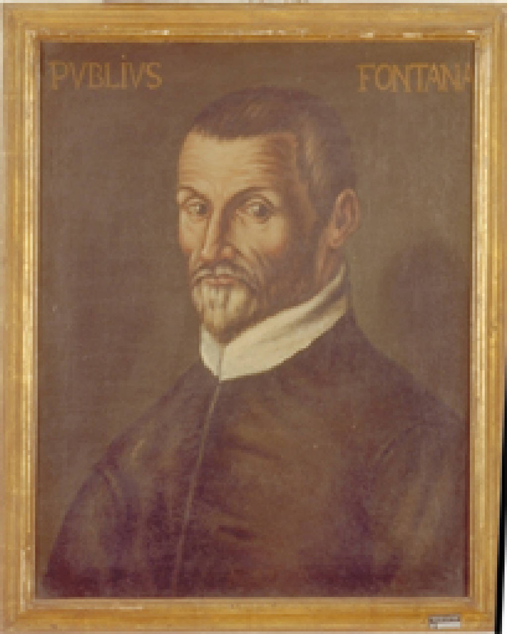 - NOTIZIE STORICO CRITICHE Il dipinto raffigura Marco Publio Fontana (Palosco, 1548 - Desenzano del Garda, 1609), letterato, poeta, botanico, accademico, parroco di Palosco dal 1569 fino alla morte. Si tratta di uno dei numerosi casi di corrispondenza iconografica tra i ritratti dipinti per l'Accademia degli Eccitati e quelli incisi da Pietro Michieli per conto del Calvi entro il 1664 per essere inseriti nella "Scena letteraria degli scrittori bergamaschi aperta alla curiosità de suoi concittadini". Appare chiaro che entrambi i repertori furono costruiti attingendo a fonti comuni, verosimilmente a ritratti distribuiti in varie sedi ma ben conosciuti a livello locale. Non è dunque vero, come pure è stato proposto, che la "Scena letteraria" sia stata assunta come fonte iconografica dagli ideatori del progetto della "Serie dei Letterati" dell'Ateneo. Nel caso in esame, la tela deriva da un'incisione di Cesare Bassano. Sia l'incisione del Bassano che quella del Michieli derivano da un esemplare più antico forse un dipinto (che non può essere tuttavia identificato con il documentato ritratto del Fontana dipinto dal Moroni, di cui resta forse traccia in un'altra incisione del Bassano). La tela in Biblioteca va senza dubbio identificata con il ritratto che il Pasta vide nel 1775 in Palazzo Vecchio a Bergamo e che risultava donato da Marcantonio Foppa nel 1673.\nCatalogo Rossi: 390/B44.