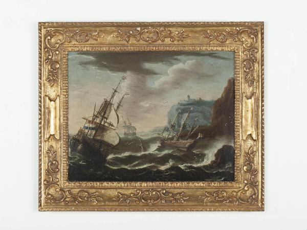 Dipinto olio su tela con la raffigurazione di un paesaggio marino: tre velieri tentano di resistere ai flutti, cercando di non andare a sbattere contro la costa presente sulla destra. Il cielo, pieno di nubi scure, minaccia tempesta. Al centro, spunta tra le onde quel che resta della prua di una nave che sta affondando.\nIl soggetto è reso con una pennellata veloce in cui predominano i tocchi di colore; predominanza di tonalità fredde.\nOpera inserita in una cornice in legno intagliato e dorato.