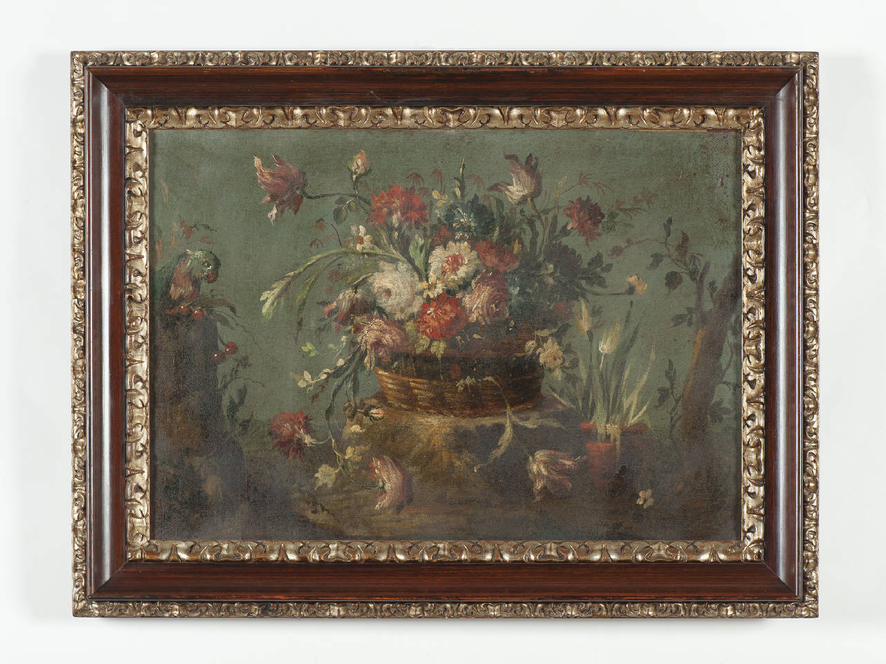 Olio su tela con vaso di fiori, entro una cornice in legno intagliato e dorato, molto probabilmente successiva rispetto alla datazione del dipinto.