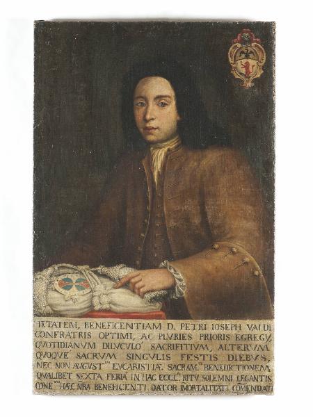 Olio su tela con ritratto di Pietro Giuseppe Valdi, raffigurato a mezzo busto. Stemma nell'angolo in alto a destra, una grande e ampia scritta nella parte inferiore della tela, con indicazioni sul personaggio raffigurato.\nLa luce proveniente da destra mette in evidenza i tratti fisionomici del volto rappresentato, predominanza di tonalità calde di colore. \nDipinto privo di cornice.