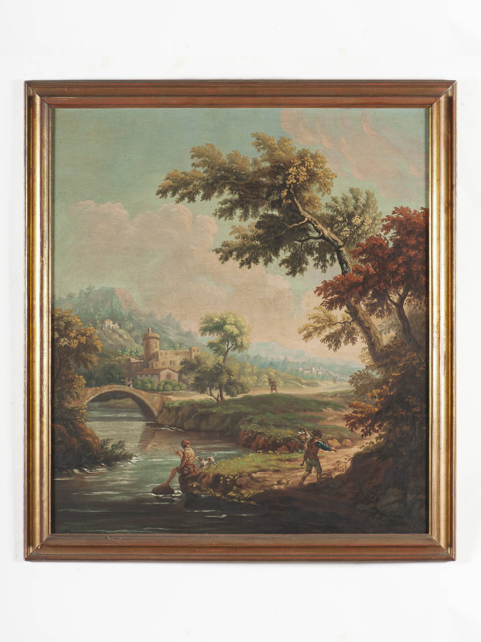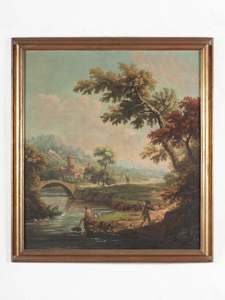 Dipinto entro cornice modanata e dorata.\nFa parte dei tipici paesaggi "a boscherecce", idealizzati e di sapore arcadico. Trattandosi di una copia, l'atmosfera bucolica fresca e luminosa tipica del Cignaroli, è quì resa in modo meno sciolto, più schematica e rigida.\nContrasti chiaroscurali per evidenziare i volumi.