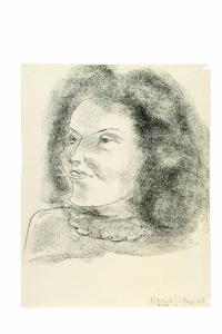 Disegno a carboncino su carta raffigurante un volto femminile visto leggermente di 3/4.