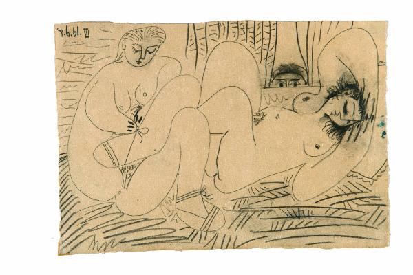 - NOTIZIE STORICO CRITICHE Il disegno fa parte della serie di opere donate nel 2017 al FAI da Clara Lavagetti, vedova di Guido Sforni, collezionista e conoscitore appassionato di arti figurative. Tra il 1959 e il 1961 Picasso lavora a una serie di disegni e dipinti ispirati al dipinto "Le Déjeuner sur l'herbe" di Édouard Manet (1863). L'opera di Manet presenta in primo piano una figura femminile nuda seduta a conversare con due uomini completamente vestiti e una donna, una bagnante, nella parte di sfondo dell'opera. Il foglio di Picasso, datato e firmato sul recto, è una ripresa personale che l'artista sviluppa sul tema del voyeurismo: due donne nude in primo piano, una riposa mentre la seconda è impegnata a legarle - o slacciarle - un sandalo, in secondo piano un curioso fa capolino inosservato da una parete.