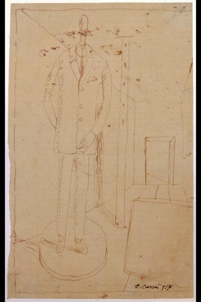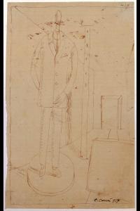 - NOTIZIE STORICO CRITICHE Dopo essersi arruolato in guerra, durante un breve ma intensissimo lasso di tempo, dal gennaio all'agosto del 1917, Carrà sviluppa una nuova consapevolezza formale che ne condiziona l'attività pittorica e le ricerche artistiche future. Nell'aprile di quell'anno, infatti, a causa di un disagio esistenziale, così intenso da determinare veri e propri disturbi fisici e nervosi, il pittore viene ricoverato presso l'Ospedale Neurologico Militare nei pressi di Ferrara, dove da qualche settimana si trovava anche De Chirico. La vicinanza con quest'ultimo decreterà nel pittore una definitiva apertura alle poetiche metafisiche. In tale contesto l'artista, infatti, produrrà alcuni fra i maggiori capolavori dell'arte carrariana come la Musa Metafisica e Madre e Figlio.\nA queste pregevoli opere si legano, se pur con significative variazioni, quattro piccoli fogli (due a inchiostro e due a matita) eseguiti nella medesima carta di recupero a quadretti (Russoli, Carrà, pp. 236-237, cat. 267-269). Tra questi, realizzato a inchiostro, attraverso un leggero tratto della penna, è il "Manichino nella stanza IV" del Civico Gabinetto di Disegni del Castello Sforzesco, acquistato per le raccolte pubbliche direttamente dall'autore dopo una personale dell'artista a Milano nel 1953 (Garberi 1991). Non collegato a nessuna opera pittorica in particolare il foglio in esame si lega però, come già accennato, alle diverse opere eseguite da Carrà nello stesso anno ed è pertanto probabile che il disegno in questione, così come gli altri, sia stato eseguito presso l'ospedale dove era in cura. Il foglio riprende le stesse caratteristiche tematiche e compositive che vedono, nell'angustia di una piccola scatola rettangolare, la figura del manichino protagonista della scena. In uno spazio claustrofobico, delimitato da lunghe fughe prospettiche del pavimento e del soffitto, il manichino occupa verticalmente l'intero spazio a sinistra dell'opera, affiancato da un elemento rettangolare, presente sia nella prima prova della serie di fogli che nell'olio con la Musa Metafisica (Vacca 2015).