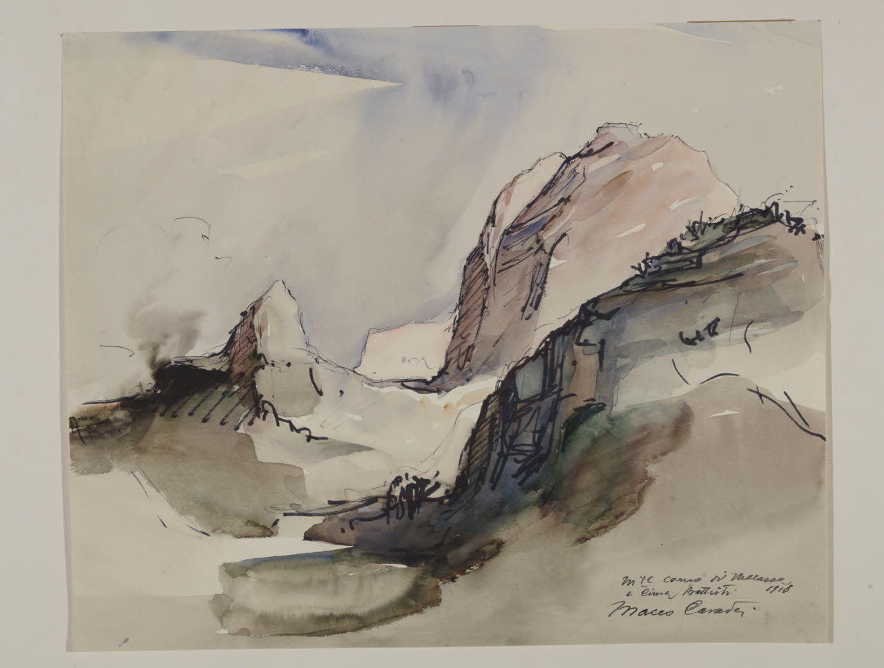 - NOTIZIE STORICO CRITICHE Maceo Casadei si colloca all'interno delle diverse correnti artistiche del Novecento come una figura indipendente nel vasto panorama culturale del XX secolo. Il pittore forlivese dopo una prima formazione di stampo postimpressionista a Lione nel 1917 è costretto a tornare in Italia per combattere la Grande Guerra. In quell'anno viene arruolato come mitragliere reggimentale alla 211a Compagnia che guerreggiava in Trentino e dove tra i monti e le trincee non smise di dipingere e disegnare. "Pur nella condizioni di profonda solitudine morale, il giovane artista avrebbe saputo affrontare quella situazione di grave disaggio conservando un proprio equilibrio e le libertà di fantasia. Anzi, essa non costituì un limite ma divenne pretesto per una non esamine interpretazione di temi ingrati e amari" (G. Viroli, Maceo Casadei. Catalogo generale - I, Forlì 1998, p. 9). \nAll'interno delle raccolte del Gabinetto di Disegni del Castello Sforzesco si conservano del pittore forlivese un vasto numero di opere realizzate durante la Prima e la Seconda Guerra Mondiale. Datati al 1918 sono alcuni disegni (Invv. Agg. 69; 71; 230; 231; 233; 235, 236; 237; 238), donati dall'artista alle raccolte pubbliche nel 1964, insieme a un nucleo di altri sette disegni (invv. Agg. 239; 70; 228; 229; 234; 232; 68), eseguiti negli anni Quaranta, quando lavorava come fotografo e pittore documentarista per il "reparto guerra" dell'Istituto Nazionale Luce. La donazione di tali opere incrementò la raccolta di Maceo Casadei all'interno delle raccolte di grafica del Castello Sforzesco; nel 1942 infatti erano stati acquistati dal comune presso la Galleria Il Milione quindici fogli di guerra (invv. 1949/1 C202/1 - 1949/15 C 202/15) esposti dalla galleria milanese alla fine del 1942.\nI disegni eseguiti nel 1918 tra le Alpi del Veneto e del Trentino descrivono paesaggi rocciosi e montagne; in alcuni di essi capeggiano diverse case e baraccamenti o figure di bersaglieri. I disegni, realizzati attraverso veloci tratti di carboncino, matita o inchiostro nero sono caratterizzati da acquerellature di tonalità marroni e grigiastre che si contrappongono all'azzurro del cielo, attraverso variazioni cromatiche di grande intensità espressiva.