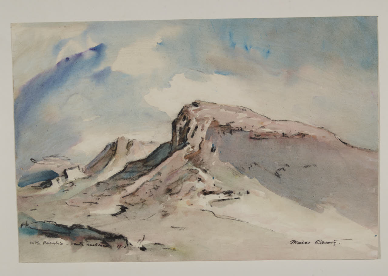 - NOTIZIE STORICO CRITICHE Maceo Casadei si colloca all'interno delle diverse correnti artistiche del Novecento come una figura indipendente nel vasto panorama culturale del XX secolo. Il pittore forlivese dopo una prima formazione di stampo postimpressionista a Lione nel 1917 è costretto a tornare in Italia per combattere la Grande Guerra. In quell'anno viene arruolato come mitragliere reggimentale alla 211a Compagnia che guerreggiava in Trentino e dove tra i monti e le trincee non smise di dipingere e disegnare. "Pur nella condizioni di profonda solitudine morale, il giovane artista avrebbe saputo affrontare quella situazione di grave disaggio conservando un proprio equilibrio e le libertà di fantasia. Anzi, essa non costituì un limite ma divenne pretesto per una non esamine interpretazione di temi ingrati e amari" (G. Viroli, Maceo Casadei. Catalogo generale - I, Forlì 1998, p. 9). \nAll'interno delle raccolte del Gabinetto di Disegni del Castello Sforzesco si conservano del pittore forlivese un vasto numero di opere realizzate durante la Prima e la Seconda Guerra Mondiale. Datati al 1918 sono alcuni disegni (Invv. Agg. 69; 71; 230; 231; 233; 235, 236; 237; 238), donati dall'artista alle raccolte pubbliche nel 1964, insieme a un nucleo di altri sette disegni (invv. Agg. 239; 70; 228; 229; 234; 232; 68), eseguiti negli anni Quaranta, quando lavorava come fotografo e pittore documentarista per il "reparto guerra" dell'Istituto Nazionale Luce. La donazione di tali opere incrementò la raccolta di Maceo Casadei all'interno delle raccolte di grafica del Castello Sforzesco; nel 1942 infatti erano stati acquistati dal comune presso la Galleria Il Milione quindici fogli di guerra (invv. 1949/1 C 202/1 - 1949/15 C 202/15) esposti dalla galleria milanese alla fine del 1942.\nI disegni eseguiti nel 1918 tra le Alpi del Veneto e del Trentino descrivono paesaggi rocciosi e montagne; in alcuni di essi capeggiano diverse case e baraccamenti o figure di bersaglieri. I disegni, realizzati attraverso veloci tratti di carboncino, matita o inchiostro nero sono caratterizzati da acquerellature di tonalità marroni e grigiastre che si contrappongono all'azzurro del cielo, attraverso variazioni cromatiche di grande intensità espressiva.