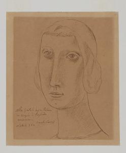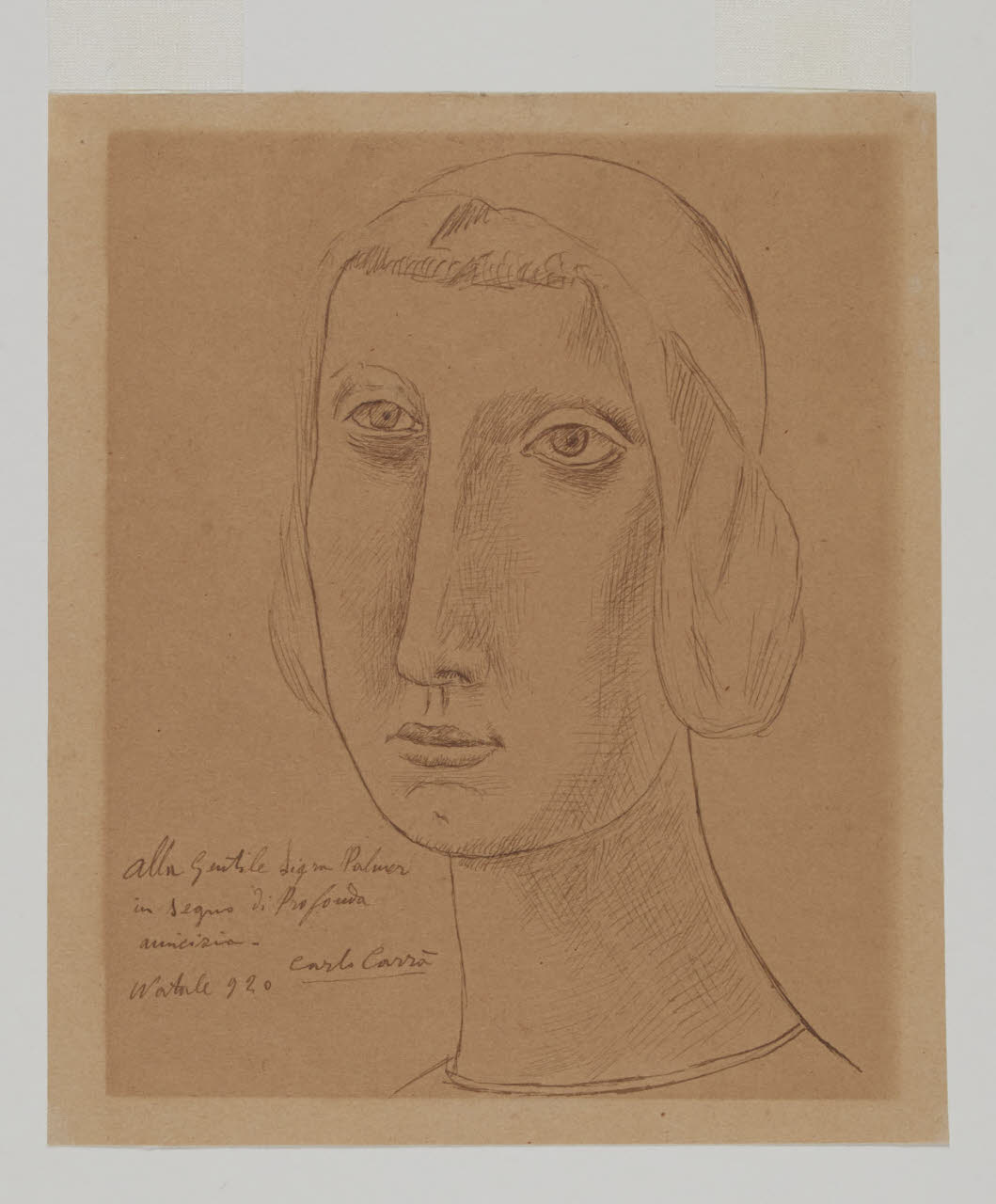 - NOTIZIE STORICO CRITICHE Nel 1920 Carrà, ormai lontano dalla poetica Futurista, continua a ricercare nella sua opera quella sintesi espressiva dell'idea che lo condurrà, al termine della propria ricerca metafisica, verso un principio di arcaica semplificazione. Il disegno con la "Testa femminile" come esplicitato nell'iscrizione autografa: "Alla gentile sig.ra Palmer in segno di profonda amicizia. Carlo Carrà Natale 920", è un dono dell'artista alla Signora Palmer, amica del pittore. Tale amicizia è documentata del resto in un altro foglio del 1917, raffigurante un volto femminile con le stesse caratteristiche fisiognomiche della donna (cfr. Russoli, Carrà 1977 p. 245 cat. 286). Ancora legato a una poetica primitivista il disegno con La signora Palmer è eseguito attraverso un tratto leggero e continuo della matita e descrive il volto della donna attraverso una delicata ricerca di plasticità; essa è resa da un chiaroscuro tenue ottenuto attraverso sottili tratti di grafite. Il foglio, oggi conservato presso le raccolte del Gabinetto di Disegni, è stato acquistato dal comune dalla signora Maria Muneroni Gatti nel 1957.