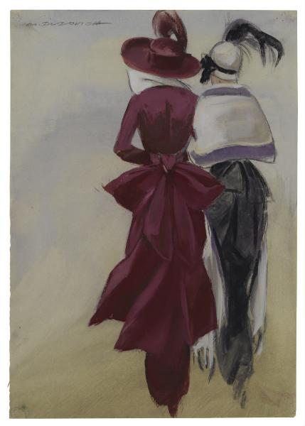 - NOTIZIE STORICO CRITICHE Marcello Dudovich, con la sua opera, è riuscito a testimoniare l'evoluzione del costume e degli interessi della società italiana della prima metà del Novecento. Dando forma e fama a numerose attività d'impresa commerciale, è divenuto l'artefice del successo del marchio o della vendita delle merci prodotte dalle ditte per cui ha lavorato. Il bozzetto con le "Due figure femminili di spalle" del Gabinetto di Disegni del Castello Sforzesco si inserisce, infatti, in quel circuito di manifesti pubblicitari realizzati per le più importanti case di abbigliamento con cui collaborò, come i Grandi Magazzini Mele o per La Rinascente. Il disegno mostra due eleganti donne che camminano lungo una strada, dando le spalle a un ipotetico osservatore che le scruta da dietro. L'artista descrive le sensuali silouettes delle donne, mostrando anche in questo caso le mode e il gusto del momento attraverso un'immagine piena di vita, traboccante di sensualità. Tutto ciò appartiene a un cosmo coloristico di grande vivacità creativa, creato attraverso veloci pennellate piatte di tempera. La pittura, infatti, tende a produrre nei tessuti degli abiti sfumature cangianti, attraverso differenti graduazioni del colore. Il disegno in questione non è stato fino ad oggi associato a nessun manifesto pubblicitario specifico, ma è anche probabile così come per altri casi, che Dudovich abbia realizzato l'opera senza nessuna finalità, se non quella di creare uno studio per due figure alla moda. Un disegno a matita molto simile alle "Due figure femminili di spalle", probabilmente un primo modello per la realizzazione del foglio in questione, è stato esposto all'interno di una mostra dedicata all'artista nel 2004 (M. Ferrari, S. Cortina, Le donne di Marcello Dudovich, Milano 2004).